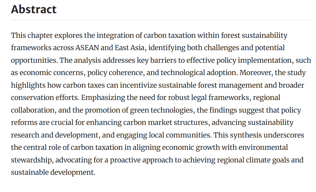 This chapter explores the integration of carbon taxation within forest sustainability frameworks across ASEAN and East Asia, identifying both challenges and potential opportunities. The analysis addresses key barriers to effective policy implementation, such as economic concerns, policy coherence, and technological adoption. Moreover, the study highlights how carbon taxes can incentivize sustainable forest management and broader conservation efforts. Emphasizing the need for robust legal frameworks, regional collaboration, and the promotion of green technologies, the findings suggest that policy reforms are crucial for enhancing carbon market structures, advancing sustainability research and development, and engaging local communities. This synthesis underscores the central role of carbon taxation in aligning economic growth with environmental stewardship, advocating for a proactive approach to achieving regional climate goals and sustainable development.